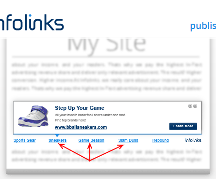 Jab aap koi text likhte ho toh, usme aap kisi proper key word ko ad ke liye choose kar sakte ho. Ex : Aapne bhut si website par dekha hoga ki, kisi article me Facebook ko highlight kiya hua hota hai, Lekin jab aap us par click karte ho toh facebook ki jagah koi ad open ho jaata hai. Toh isi tarike se hi Infolinks kaam karta hai.